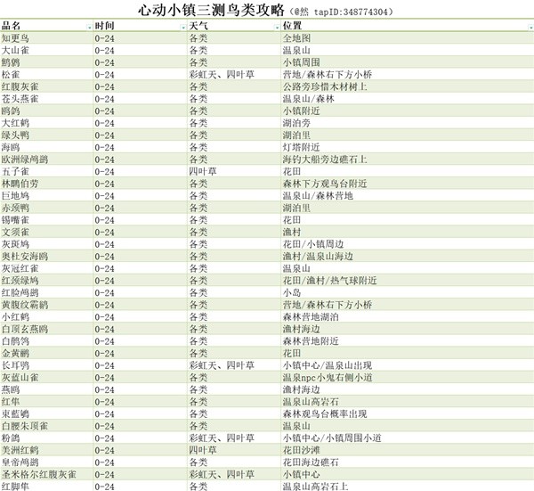 《心动小镇》地图中分布着各种鸟类,那么这些鸟的都在什么地点和时间出现呢,下面请看“乔治治”带来的《心动小镇》鸟类出没时间及位置一览,希望能够帮助大家。