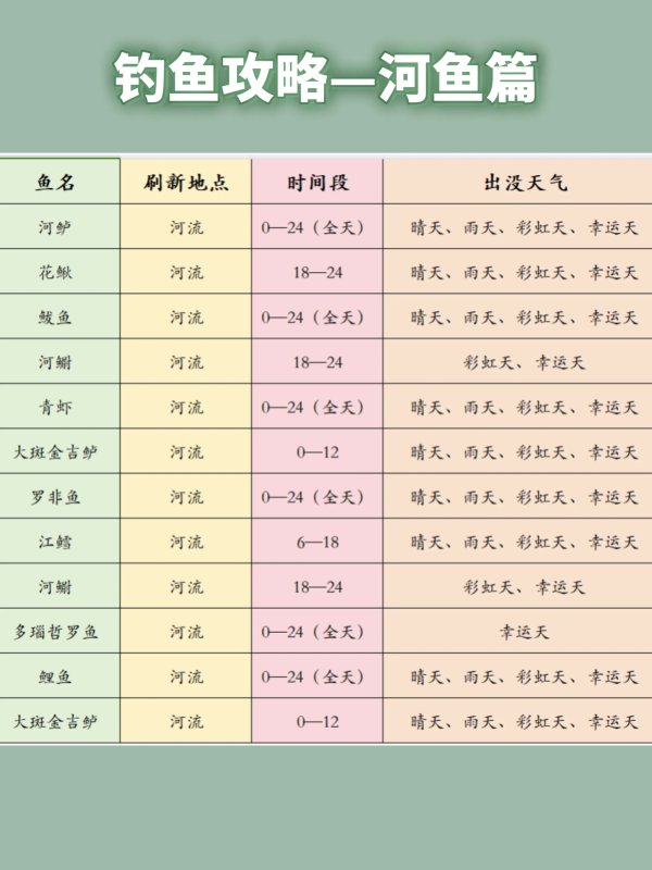 《心动小镇》中有着独特的钓鱼玩法,玩家根据时间与天气的不同会钓上来不同品种的鱼,下面是由“爱玩游戏的喵喵”为大家带来的《心动小镇》各河鱼出没天气及时间一览,希望可以帮助到大家。
