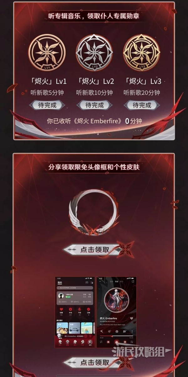 除此之外还可以通过收听专辑音乐和分享活动来领取QQ音乐APP中的勋章、头像框和皮肤奖励。