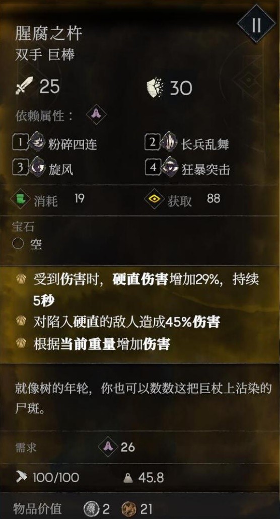 大棒子,要求是26纯信仰非常离谱,全是输出技能。没实战用过,有点丑,看属性输出应该很暴力。主线推到无名山,最后双头boss掉落