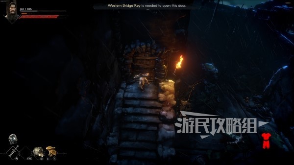到达圣城并触发支线【旅馆老板的丈夫】后,需要返回浅滩区域寻找NPC戈登。浅滩低语的正上方有一座高塔,爬两个梯子到达高塔顶层,跳过断桥的缺口即可找到旅馆老板的丈夫戈登,他头上有个技术呢感叹号,旁边还有一具尸体,尸体旁边有个战利品,这个战利品就是【西桥钥匙】,拾取即可。