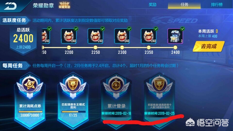 通过完成每周活跃度任务,获取积分升级。活跃度周上限为400,总上限为2400,即9周中最快6周就能拿到所有的活跃度任务奖励!通过活跃度任务一共可获得9000荣耀勋章积分!
