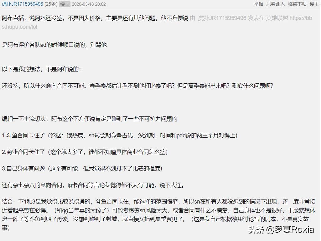 一般来说即便是转会期不想打职业也会发表公告提前告知,到现在既没有签约俱乐部也没有声明出来还是很奇怪的。但是在最近阿布的直播间说的一番话倒是让人对阿水的情况产生了一些猜测,阿布表示阿水之所以没有签约并非是因为价钱的原因,还有很多其他的外在原因。所以就有很多网友开始猜测到底是什么原因导致阿水到现在都没有办法签约的原因,其中最大的可能性应该是在IG时签约的商业合同被卡了,导致他没有办法好无顾虑的转到其他俱乐部。但是真实情况如何,现在还不得而知。