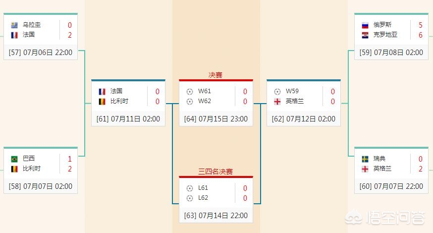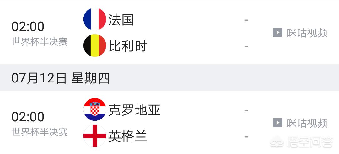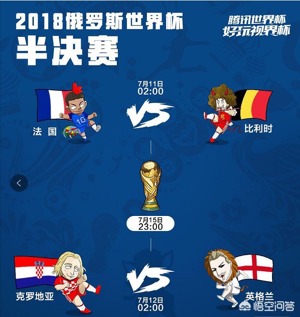具体的对决情况是7月11日2:00法国队-比利时,7月12日2:00克罗地亚-英格兰。双方的胜者将在7月15日23:00进行冠亚军之战。