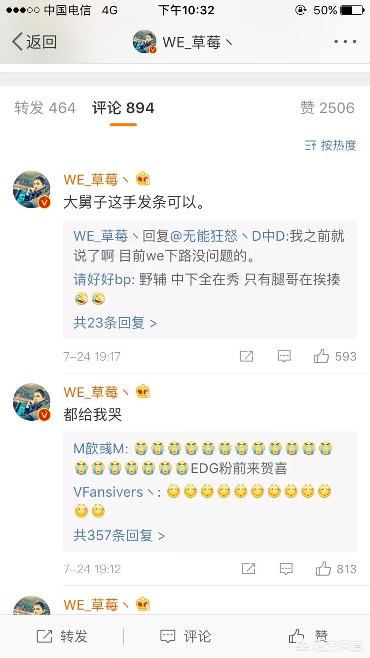 一直心系WE的前WE上单草莓就全程看了比赛并且第一时间发博表达了自己的激动心情。