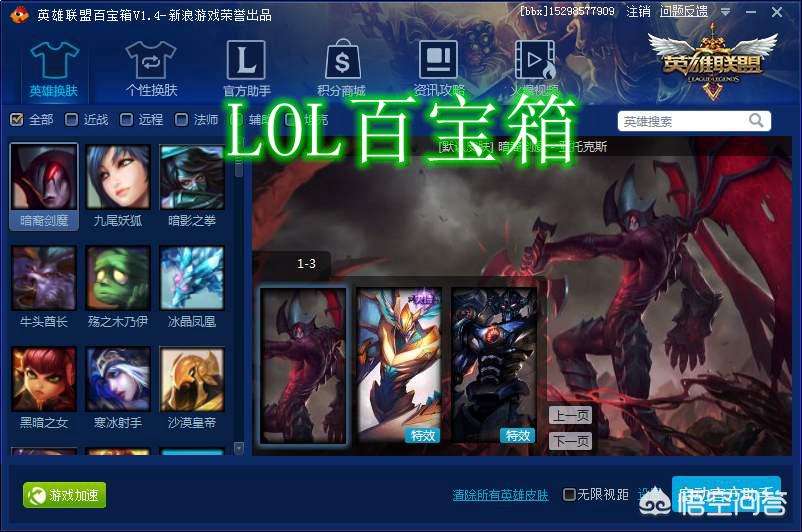 在之前两位软件的奉献下,有一款软件还是冒着不怕死的精神为我们传递打到腾讯的正能量,那就是LOL百宝箱,这款软件也非常赞,每款皮肤都可以使用,LOL新皮肤出现之后更新软件就可以继续使用,不知道更新了多久,这款软件再也不能用了,登陆后居然写着购买皮肤!