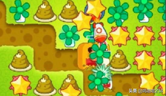 5、通过风扇炮塔清理道具得到了许多深海蘑菇炮塔。在萝卜处建造一个星星炮塔然后开始清理地图右侧的道具。