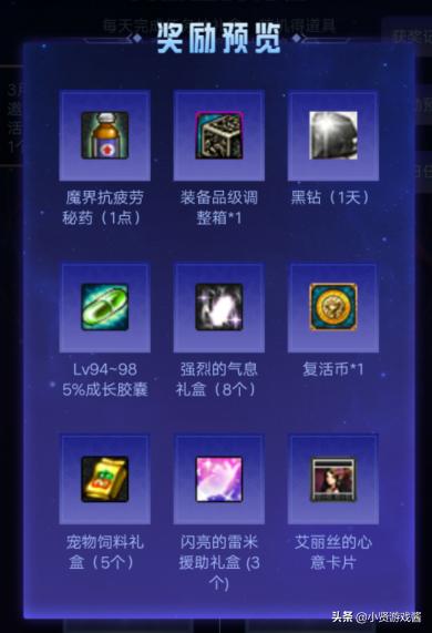 接下来我们来看看奖励,奖励有疲劳药(1点),装备品级调整箱,黑钻(1天),经验胶囊(5%),强烈气息(8个),复活币(1个),宠物饲料(5个),雷米援助(3个),爱丽丝的心意卡片。