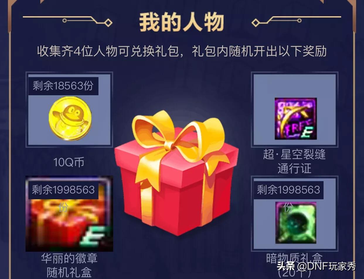 (3)累计收集齐四张NPC卡片,可以开一个随机礼盒,随机获得下面四种奖励:10QB,超星空门票,华丽随机徽章,20个暗物质;