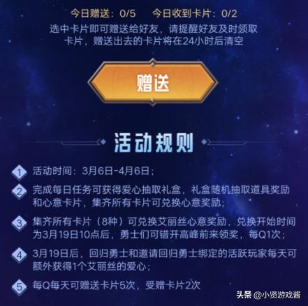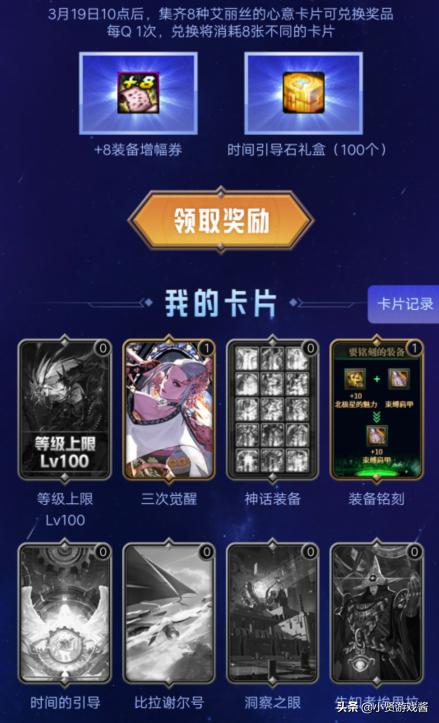 最后我们来看看最终的奖励,获得最终奖励的要求就是集齐8张卡片,在3.19日之后就可以领取一张+8装备增幅卷和100个时间引导石,要注意的就是奖励是每个账号兑换一次的,并且卡片是可以赠送的,一个账号一天可以赠送五次卡片,收取两次卡片。