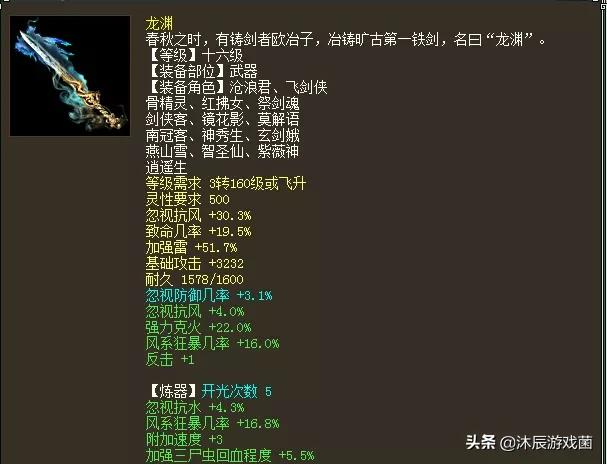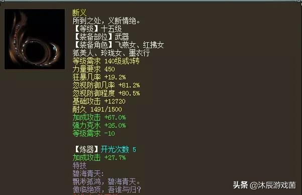 看完了仙族武器,最后再看一件大力专属。双破超过80(破物理几率和破物理程度)而且基础攻击也不少,底子算是个小极品。而炼化属性几乎属于可遇不可求的那种,超高的加成攻击,外加主流的克水属性让这把武器如虎添翼。最让人意外的是开光炼器居然出现了27点加成攻击,说实话这样的数据即使放在全服来看也算极品。话说这样的装备和4破你会选择哪个呢?