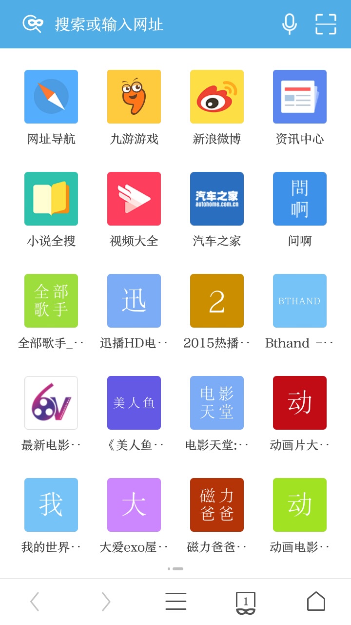 UC浏览器的首页则仍然保持一贯的简洁样式,顶部是搜索框及几大类应用的导航,下方则是常用网址及UC头条的新闻聚合。
