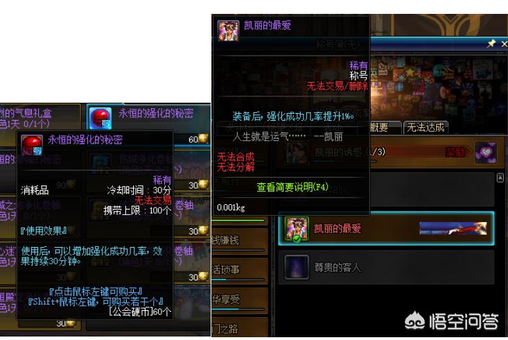 强化没药可以在公会NPC守护精灵处购买,凯丽的最爱称号则需要将稀有及以上装备强化(或增幅)至+10及以上,并且成功30次(包括神器,传说,和史诗,异界装备不包括),想要快速的获得凯丽的最爱称号,可以在拍卖上面买价格低的+9装备之后自己强化+10。