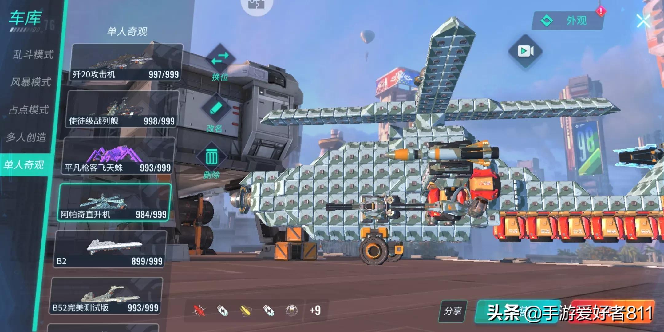 玩家可以自己组装机甲,飞机、坦克、跑车、变形精钢、动物、昆虫等形态,看个人创造能力!一般机甲由移动模块、基础模块、武器模块组装而成,可移动、飞行、攻击。搭配不同的武器、移动模块,对战效果也不一样。如机械腿和轮胎:机械腿移速慢,但是可前后左右移动;轮胎移速快,但是只能前后移动!游戏模式分为:对战模式(无限擂台,风暴模式~)、创造模式(单人奇观、多人创造)。