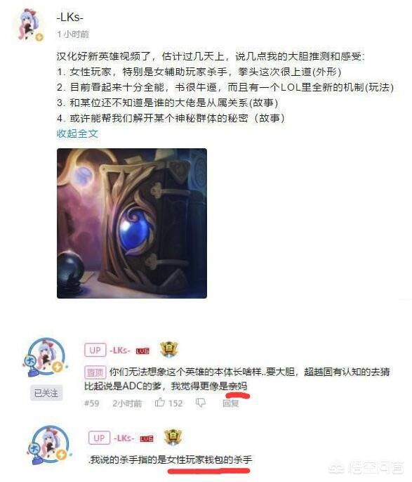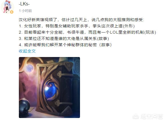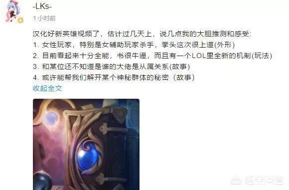 在新英雄发布之前拳头也是一直守口如瓶没有放出任何一点的消息出来,但是和拳头有着比较密切关系的B站UP主lks则是对于新英雄有了一个不是太具体的透露,从这个透露当中我们可以的出来的消息有:1.是个女性辅助英雄。2.全新机制并且非常厉害。3.和某个英雄有联动。
