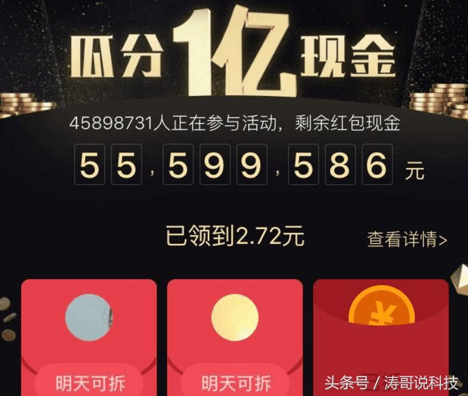 继支付宝瓜分10亿红包之后,小米也是赶上甩1.5亿红包劵,而现在腾讯也是不甘示弱,终于开始放大招!直接甩出一亿现金红包出来瓜分,有网友说到,早猜到腾讯不会甩那么多红包出来的,还不如支付宝的10亿红包给力,实在垃圾!