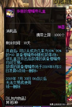 魔盒一直都有开增幅券的活动,更是能够开出来+12的增幅券,所以这次的+11增幅券加入魔盒,也并不算很稀奇。拍卖行一直都有各类增幅券的,只要你有钱舍得买,全身增幅12都是行的。