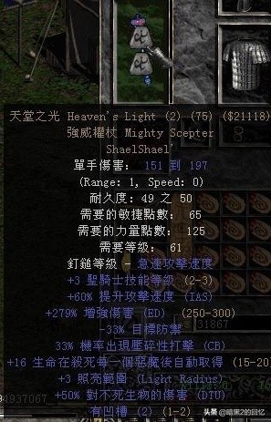 武器:2孔天堂之光镶2个13#,速度达到55ias到急速。