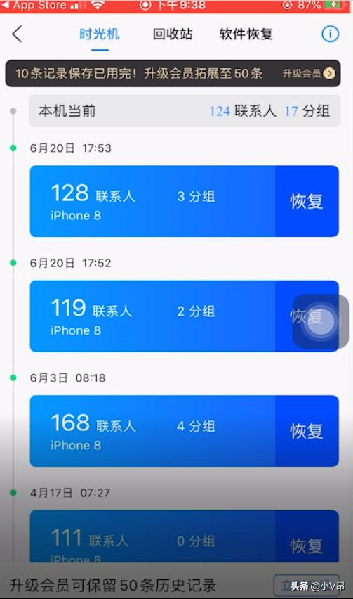 4、选择需要还原的通讯录,点击恢复按钮即可。