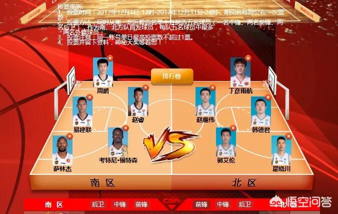 投票分为南区北区,两边各有10之队伍,按照后卫、中锋、前锋,为喜欢的球队中喜欢的球员投票即可,当然记得一定要全部选好!国内的全明星赛完全凭借个人喜欢,只掺杂感情不掺杂别的,为自己喜欢的球员投票吧!