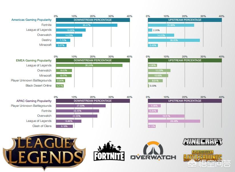 上图是各地区的游戏排名可以看到守望先锋在美洲地区、EMEA地区以及亚太地区的受欢迎程度都是非常高的。至于欧洲区因为有CSGO的存在,所以守望先锋并没有其他地区那么火爆。