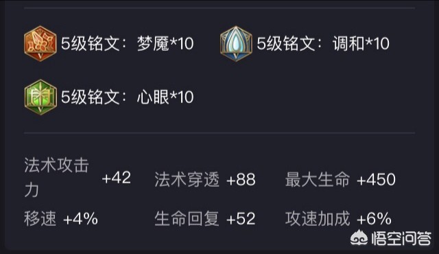 然后就是对于铭文和出装方面的啦,对于铭文的话,小编就不多说了,详情可以看上图,也就是88法穿的铭文,只有这样的话才具有一定的伤害,而对于出装的话可以选择面具、鞋子、极寒风暴和魔女斗篷、脑子等等,不仅有肉,又有输出。