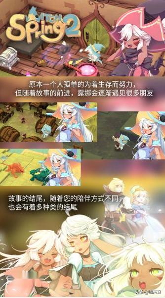 拓展资料:《魔女之泉2》是由韩国游戏开发公司Kiwiwalks制作,以童话故事为背景的角色扮演类游戏,是春巫的续作。清新可爱的3D画面和RPG成长模式,让我们重温曾经的经典,一起与美少女魔女露娜去冒险吧!《魔女之泉2》以童话故事为背景,采用了可爱的3D画风,呆萌的人设和清新的画面令人眼前一亮。游戏风格和玩法也延续了前作的特色,虽然游戏主角选用了全新的人设,但清新可爱的3D画面和RPG成长模式依然能让我们重温曾经的经典。玩家要完成游戏主线和特定任务,游戏会结束并根据你最后的状态给出各种结局。随着故事的进行,露娜将遇到新的朋友,并取决于她的成就,对故事的结尾,将是更充实的结局。请帮助露娜融合外面的世界!