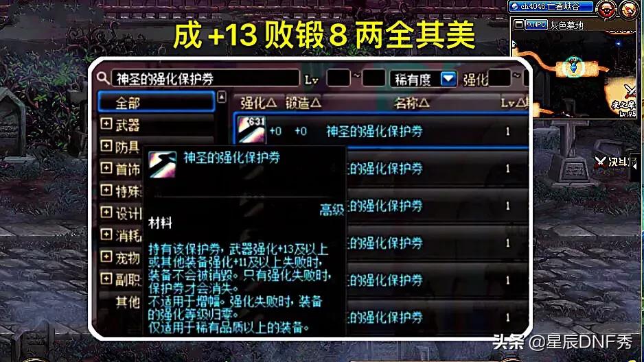 获取武器,用强化保护券丢13,成功则跨界给百分比大号使用,失败则自用,或者跨界给固伤职业使用!这样,一张强化保护券的花费,保底获得一把100级传说锻8装备,不论成功还是失败,都有收获,可不要傻傻的强碎了,换6个强烈的痕迹啊。