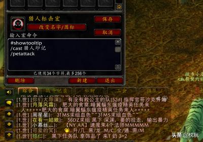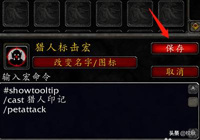 3【输入命令】把需要的宏命令输入或复制到"输入宏命令"那个空白框中,再点击保存。宏命令:#showtooltip/cast 猎人印记/petattack(把以上命令复制到宏命令空白框中)