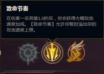 第一个可以选择强攻,金克丝攻速上来后很快就触发这个被动了,提升额外伤害,如果你喜欢攻速更快就选致命节奏吧