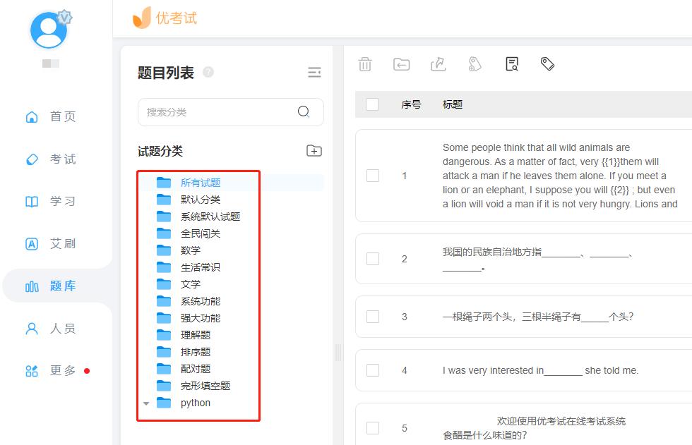 - 批量导入试题。优考试为用户提供了批量上传试题的模板,用户只需将模板中的试题内容替换成目标试题,即一键批量上传试题;
