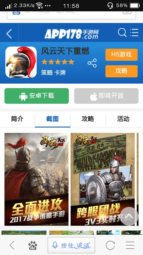 2017泛经营策略大作《风云天下:重燃》继承单机对战精髓,以恢弘的世界观,深刻地展现冷兵器时期全面战争的宏伟场景,一边经营,一边战斗! 【游戏介绍】西元220年,人以势力部落为单位群居,称之为“国”,为争夺资源地,国与国战争不断。百年烽火中,诞生了一位王者,他通过招募和操作古代名将和各类兵器,亲身经历与挑战古代著名战役,实现自身的君王霸业。