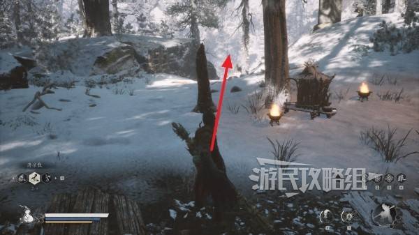 往下跳几层,沿着树干走到另一侧,再沿着山壁往下跳到底,就能看到土地庙。