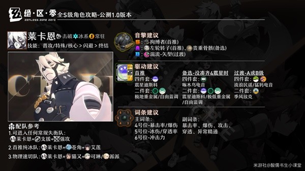 《绝区零》莱卡恩是一个冰系击破角色,很多玩家抽到后不知道如何培养他,下面请看“酸儒书生小课堂”带来的《绝区零》莱卡恩培养攻略,希望能够帮助大家。