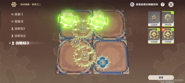 然后依次在2号柱放大齿轮,1号柱放中齿轮,3号柱放大齿轮,即可完成挑战。