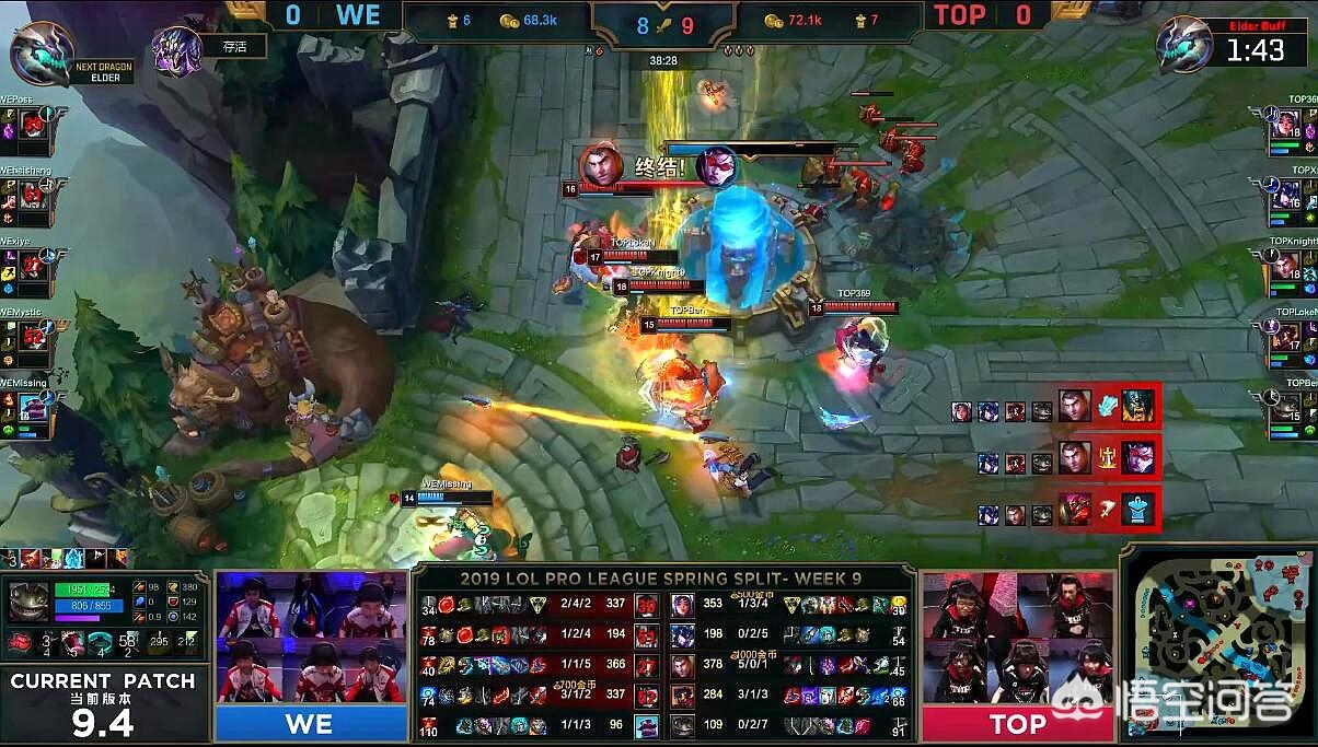 相信大家都还记得POSS零参团拿下MVP的那场比赛,POSS想继续效仿。但是很明显TOP也研究过这场比赛,所以牧魂人这一把没有那么好发挥,当牧魂人单带被抓后WE的节奏断档。WE自己都没想到就这短短的一个空档,TOP就拿下了大龙。随后又发生远古龙争夺,在布隆大招用掉的情况下WE已经没有什么控制技能了,薇恩发育良好但是已经没有输出空间了。