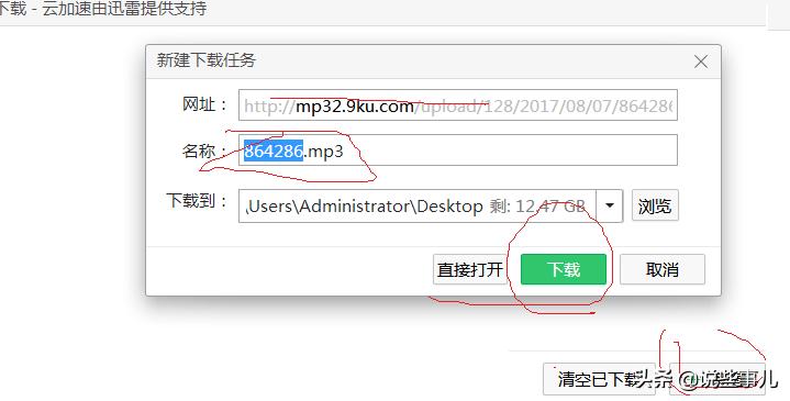 4、复制这段地址,在浏览器中选择下载或使用迅雷等下载软件,然后点击“新建下载”就可以下载这首MP3歌曲。