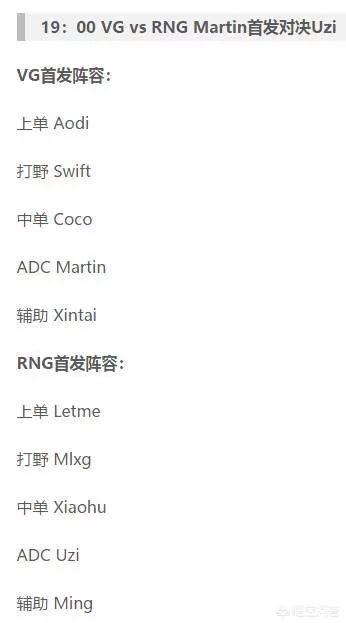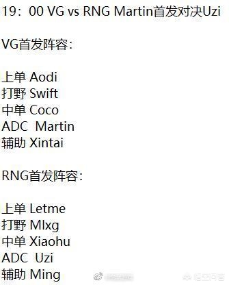 VG跟RNG的首发阵容名单发出了,VG这边没什么变化依旧是正常首发阵容,RNG这边就有些意思了。上单Letme、打野Mlxg、中单Xiaohu、下路Uzi+Ming,这个RNG阵容可以说是RNG的最强阵容了,看来RNG对VG这场比赛是势必拿下,而且也给到了足够的尊重。