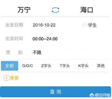 步骤2、填写起始站(左) 和 终点站(右) 以及出发时间,点击查询。以万宁到海口为例。
