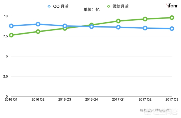 这是2017年,QQ和微信的月活跃用户数量的折线图。可以看到,QQ和微信的用户数量,都在7.5亿以上。