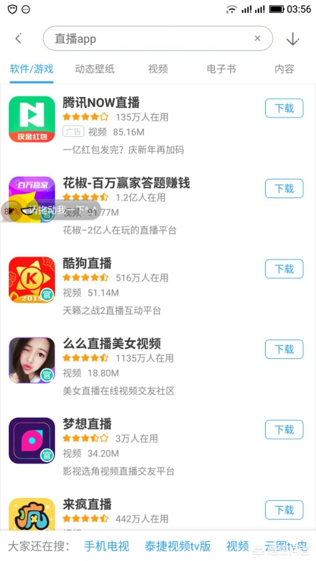 总结:由于社交直播软件占空间,内存不固定,因此市面上目前没有一款app可以直接运营(或涵盖)所有直播app,都需要借助第三方下载平台或官方单个下载。