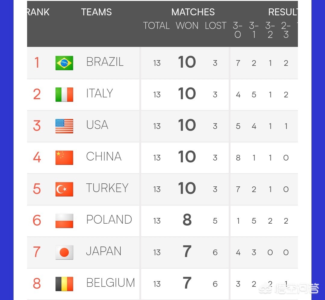 中国女排也还以10胜3负的战绩排在第四位。在北仑站的首场比赛中,中国女排轻松战胜德国女排,所以保持排名不变。而土耳其女排则是意外的输给比利时女排,于是她们的排名也是降到第五位,由于世联赛分站赛只剩两轮比赛,目前的土耳其女排已经锁定世联赛总决赛名额。