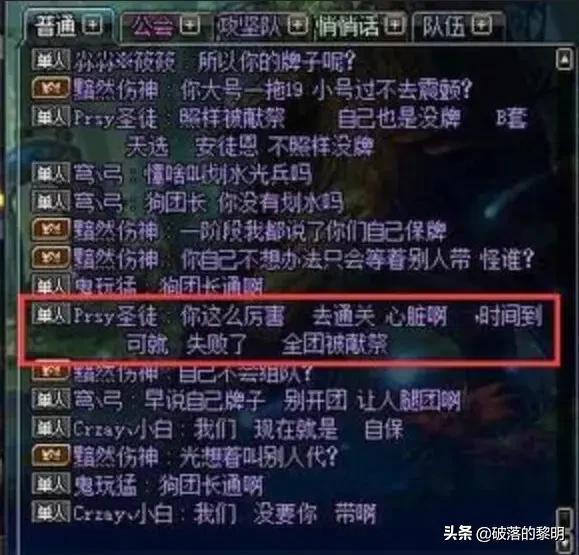 这个名叫“黯然伤神”的玩家曾经在安图恩团本时期献祭过上千名玩家,脸皮超级厚的他称这种行为是“打击混子”,其实所有玩家心里都明镜似得,他就是没事闲的祸害人取乐,这种可耻行为在持续了一段时间之后终于引起了所有玩家的愤怒,大家开始集体抵制他,看到任何挂着“单带任何图”冒险团标识的玩家都会直接踢出团,就算他自己开团,也会有很多故意炸团的玩家去狙击他,导致他一直到现在都是无团可打的窘况,目前装备也都是靠金团或者飞机团才勉强凑齐。