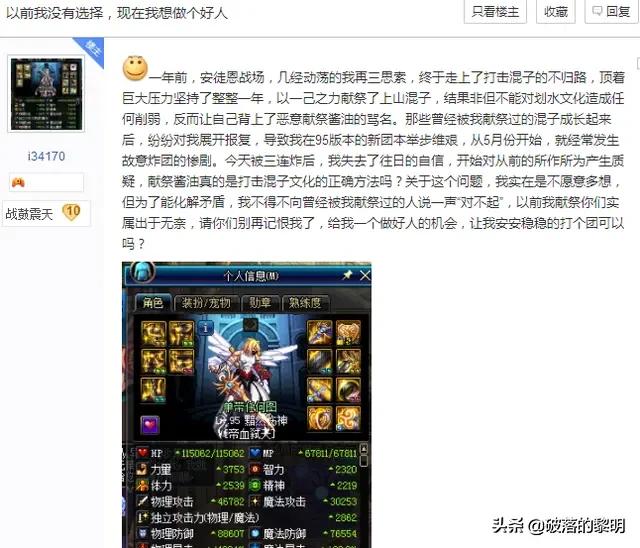屠戮哥在贴吧发文称:以前所做是没有选择,现如今只想做个好人,好好打团,希望大家能够原谅他。