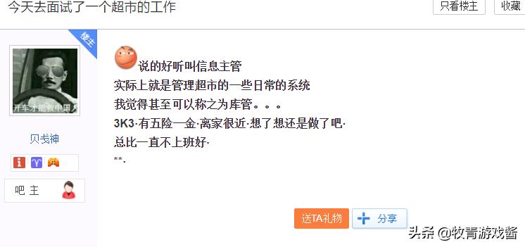 最搞笑的是这位老哥找的不是年入十万以上体面工作,反而是学徒、库管之类的工作,实在是有失dnf吧主的身份。即使开个直播,做个视频,利用一下dnf的资源,想必也能找到出路。