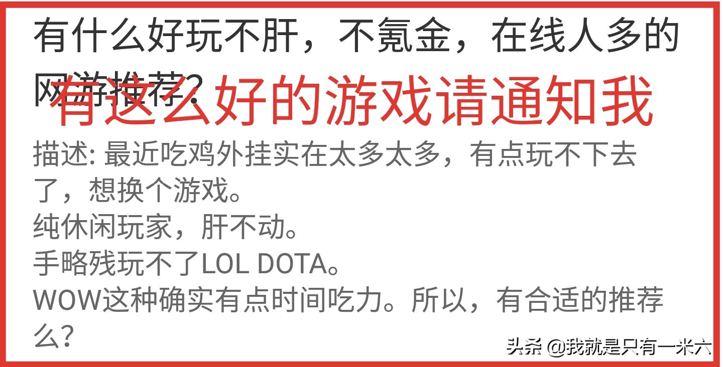 本来以为只是一次简单的游戏推荐,但看了这位兄弟的要求之后,我也想纳闷了,真的有这么好的游戏吗?不肝不氪金?本来想推荐一波单机的,但又要是网游,还要人多,其实现在人多的几款游戏大家都知道,没什么好选择的,要么氪金,要么爆肝,要么凭操作,可你还偏偏适合手残党…………