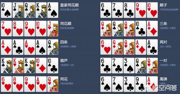 即德克萨斯扑克,五张牌按照同花顺、四条、葫芦、同花、顺子、三条、对子、单张的顺序比大小,因为牌比较多,加上随机发,基本不可能出现斗地主那样的记牌情况。2个人就可以玩,人多也不限,可以一堆人一起玩的,比较有意思。