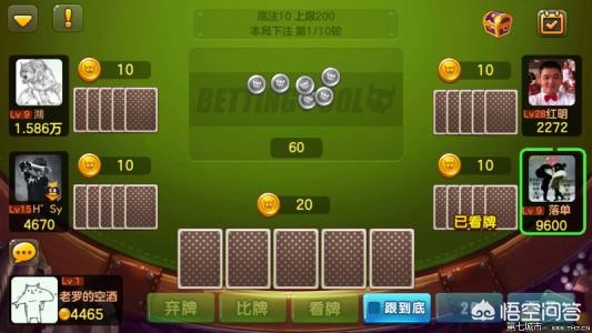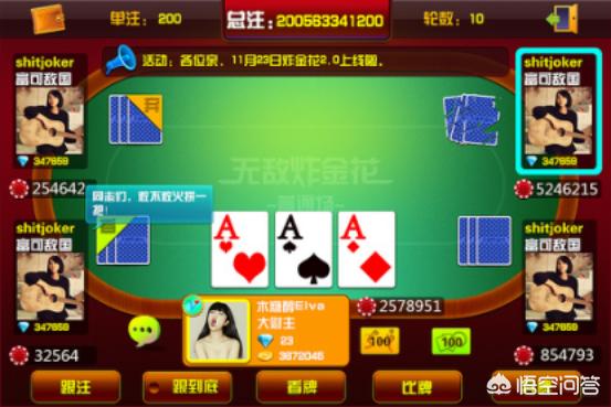 每人发三张牌,按照豹子、同花、顺子、对子和单张的顺序来比大小,一般都不允许老牌,然后盲加注,最后比牌的大小获胜。炸金花特别考验人的心理、胆识和演技。