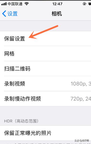 3、接着点开“相机”界面第一栏“保留设置”,如下图所示。