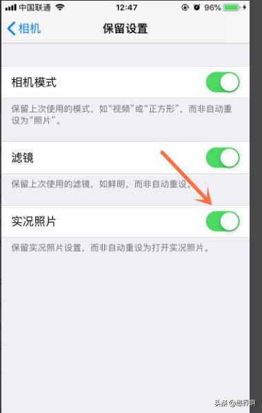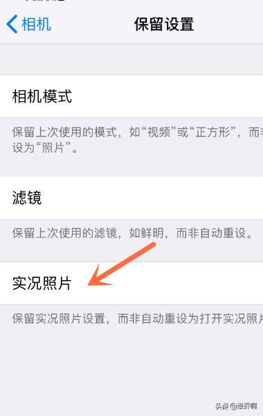 4、在“保留设置”里面,最下面是“实况照片”的设置,写着“保留思考照片设置,而非自动重设为打开实况照片”。由此可知,手机拍照每次都会自动打开实况,而关闭的方法则是“保留关闭的设置状态”,所以,在关闭的情况下,打开这个功能保留设置,就能永久关闭实况了。